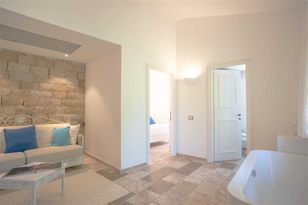 SUITE AURA: o rozloze 65 m2 se nachází v 1. patře s výhledem na moře. Skládá se z ložnice s manželskou postelí, dále je k dispozici rozkládací pohovka, koupelna s tureckou lázní, druhá koupelna s vanou. V ceně pokoje je rezervace altánu v zahradě s výhledem na moře s nealko nápoji v plážovém baru zdarma. Max. obsazenost 4 osoby - 5 lůžko na vyžádání.