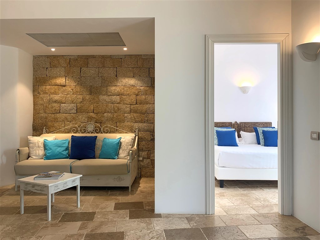 JUNIOR SUITE Janas: prostornější pokoje o rozloze 40 m2 se nachází v přízemí s teráskou a částečným výhledem na moře. Skládá se z ložnice s manželskou postelí a obývací částí s rozkládací pohovkou. Nově zrekonstruovány, k dispozici je navíc kávovar. V ceně pokoje je rezervace altánu v zahradě s výhledem na moře a nealko nápoji zdarma v plážovém baru. Max. obsazenost 4 osoby.