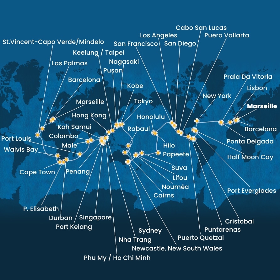 Marseille (Francie) - Barcelona (Španělsko) - Lisabon (Portugalsko) - Ponta Delgada (Portugalsko) - PRAIA DA VITORIA - New York (USA) - New York (USA) - Port Everglades (USA) - Port Everglades (USA) - Half Moon Cay (Bahamy) - Cristobal (Panama) - Puntarenas (Kostarika) - Puerto Quetzal (Guatemala) - Puero Vallarta (Mexiko) - Cabo San Lucas (Mexiko) - San Diego (USA) - Los Angeles (USA) - Los Angeles (USA) - San Francisco (USA) - San Francisco (USA) - Honolulu (USA) - Hilo (USA) - Papeete (Franc. Polynésie) - Suva (Fidži) - LIFOU - Nouméa (Nová Kaledonie) - Sydney (Austrálie) - Sydney (Austrálie) - Newcastle, New South Wales - Cairns (Austrálie) - RABAUL - Tokyo (Japonsko) - Tokyo (Japonsko) - Kobe - Nagasaki (Japonsko) - Pusan (Jižní Korea) - Keelung / Taipei - Hongkong (Čína) - Hongkong (Čína) - Nha Trang (Vietnam) - Phu My / Ho Chi Minh - KOH SAMUI (Thajsko) - Singapur (Singapur) - PORT KELANG - Penang (Malajsie) - Colombo (Srí Lanka) - Male (Maledivy) - Port Louis (Mauritius) - Durban (Jihoafrická r.) - P. ELISABETH - Cape Town (Jihoafrická r.) - Walvis Bay (Namíbie) - Mindelo (Kapverdy) - Las Palmas (Španělsko) - Barcelona (Španělsko) - Marseille (Francie).