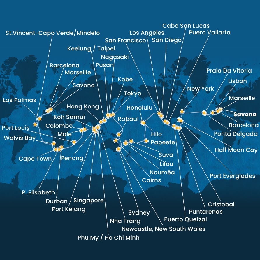 Savona (Itálie) - Marseille (Francie) - Barcelona (Španělsko) - Lisabon (Portugalsko) - Ponta Delgada (Portugalsko) - PRAIA DA VITORIA - New York (USA) - New York (USA) - Port Everglades (USA) - Port Everglades (USA) - Half Moon Cay (Bahamy) - Cristobal (Panama) - Puntarenas (Kostarika) - Puerto Quetzal (Guatemala) - Puero Vallarta (Mexiko) - Cabo San Lucas (Mexiko) - San Diego (USA) - Los Angeles (USA) - Los Angeles (USA) - San Francisco (USA) - San Francisco (USA) - Honolulu (USA) - Hilo (USA) - Papeete (Franc. Polynésie) - Suva (Fidži) - LIFOU - Nouméa (Nová Kaledonie) - Sydney (Austrálie) - Sydney (Austrálie) - Newcastle, New South Wales - Cairns (Austrálie) - RABAUL - Tokyo (Japonsko) - Tokyo (Japonsko) - Kobe - Nagasaki (Japonsko) - Pusan (Jižní Korea) - Keelung / Taipei - Hongkong (Čína) - Hongkong (Čína) - Nha Trang (Vietnam) - Phu My / Ho Chi Minh - KOH SAMUI (Thajsko) - Singapur (Singapur) - PORT KELANG - Penang (Malajsie) - Colombo (Srí Lanka) - Male (Maledivy) - Port Louis (Mauritius) - Durban (Jihoafrická r.) - P. ELISABETH - Cape Town (Jihoafrická r.) - Walvis Bay (Namíbie) - Mindelo (Kapverdy) - Las Palmas (Španělsko) - Barcelona (Španělsko) - Marseille (Francie) - Savona (Itálie).