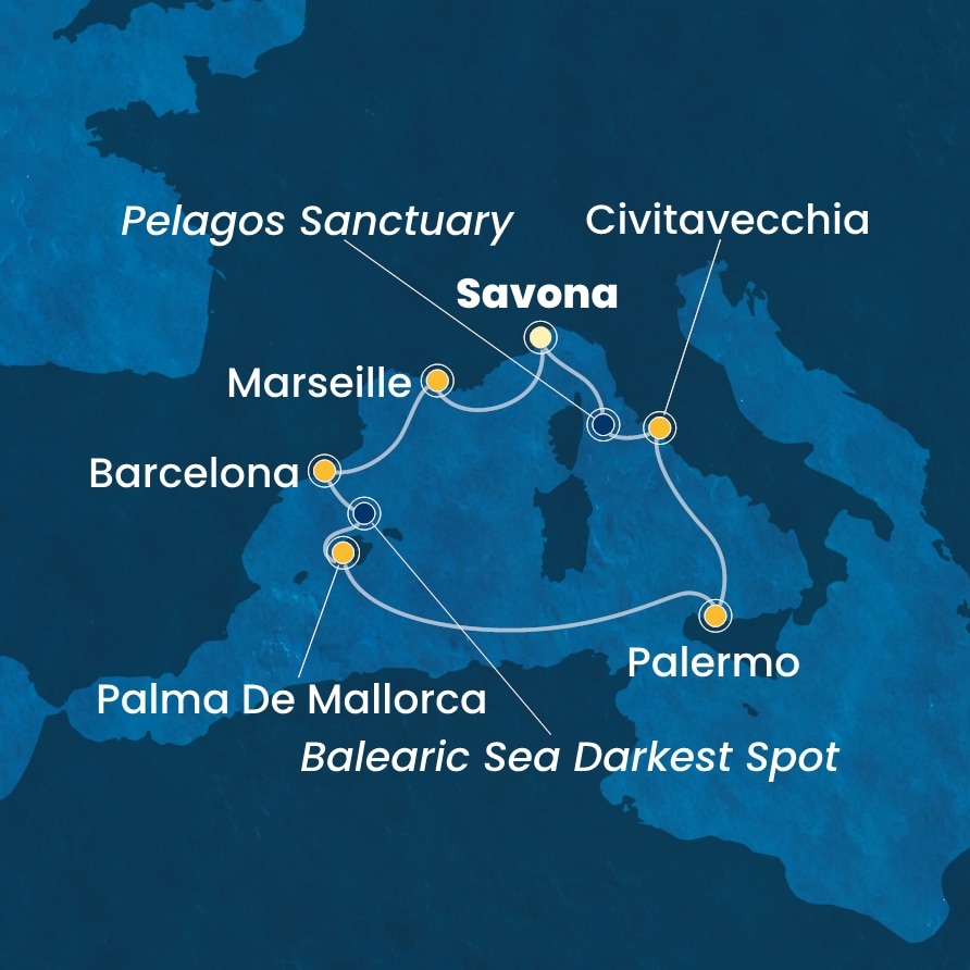 Savona (Itálie) - Marseille (Francie) - Barcelona (Španělsko) - Palma de Mallorca (Španělsko) - Palermo (Itálie) - Civitavecchia (Itálie) - Savona (Itálie).