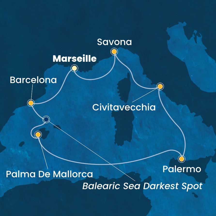 Marseille (Francie) - Barcelona (Španělsko) - Barcelona (Španělsko) - Palma de Mallorca (Španělsko) - Palermo (Itálie) - Civitavecchia (Itálie) - Savona (Itálie) - Marseille (Francie).