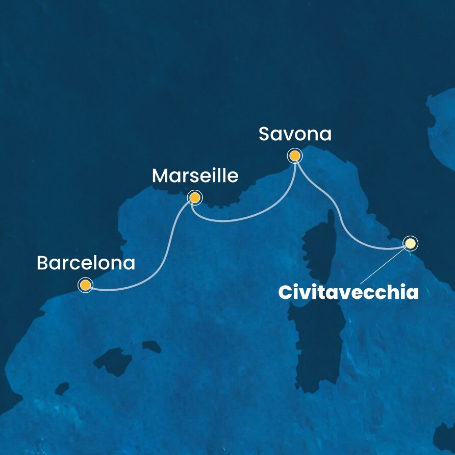 Civitavecchia (Itálie) - Savona (Itálie) - Marseille (Francie) - Barcelona (Španělsko).