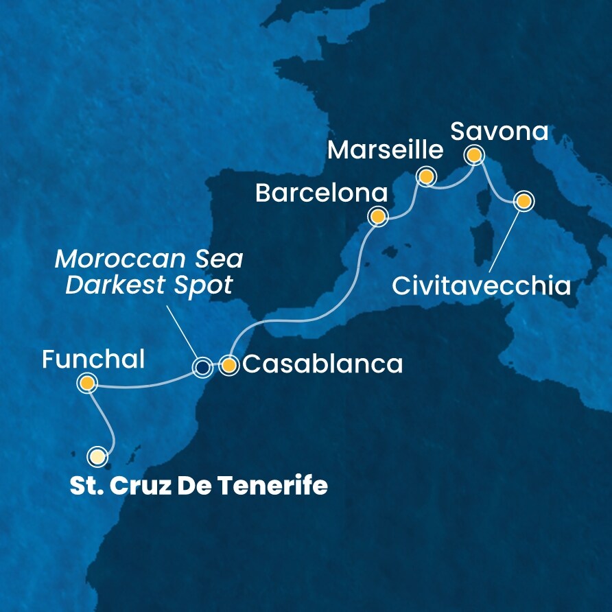 St. Cruz de Tenerife (Španělsko) - Funchal (Portugalsko) - Casablanca (Maroko) - Barcelona (Španělsko) - Marseille (Francie) - Savona (Itálie) - Civitavecchia Rome.