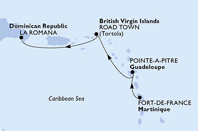 Fort de Francie (Martinik) - Pointe-a-Pitre (Guadeloupe) - Road Town (Tortola) (Panenské o. (britské)) - La Romana (Dominikán.rep.).