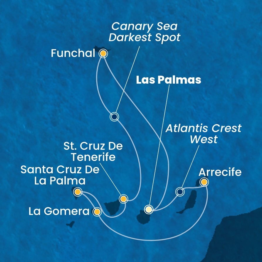 Las Palmas (Španělsko) - Funchal (Portugalsko) - St. Cruz de Tenerife (Španělsko) - Santa Cruz de la Palma (Španělsko) - La Gomera (Španělsko) - Arrecife (Španělsko) - Las Palmas (Španělsko).