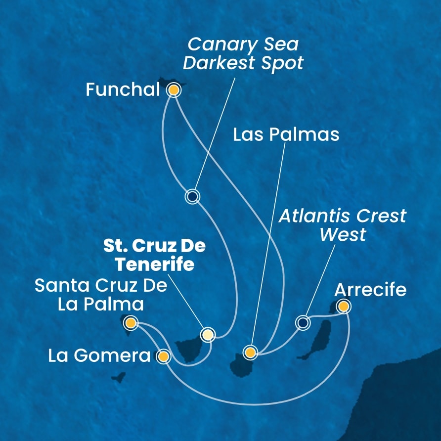 St. Cruz de Tenerife (Španělsko) - Santa Cruz de la Palma (Španělsko) - La Gomera (Španělsko) - Arrecife (Španělsko) - Las Palmas (Španělsko) - Funchal (Portugalsko) - St. Cruz de Tenerife (Španělsko).