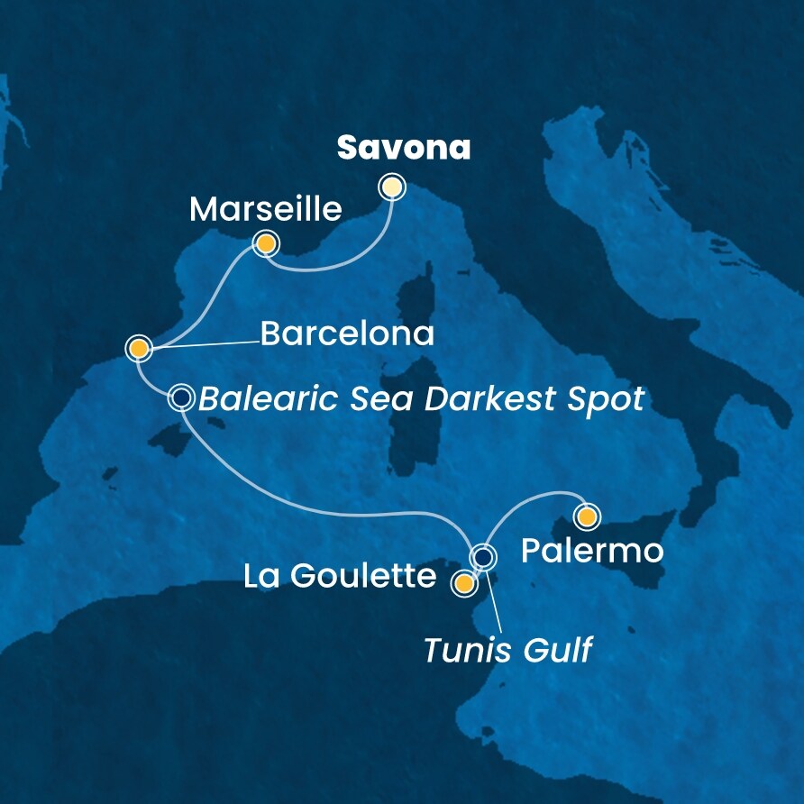 Savona (Itálie) - Marseille (Francie) - Barcelona (Španělsko) - La Goulette (Tunisko) - Palermo (Itálie).