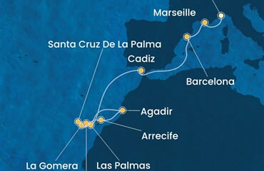 Marseille (Francie) - Barcelona (Španělsko) - Cadiz (Španělsko) - Las Palmas (Španělsko) - La Gomera (Španělsko) - Santa Cruz de la Palma (Španělsko) - St. Cruz…