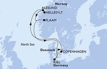 Kiel (Německo) - Kodaň (Dánsko) - Hellesylt (Norsko) - Alesund (Norsko) - Flaam (Norsko) - Kiel (Německo). Loď je součástí flotily plavební společnost MSC Cruises,…